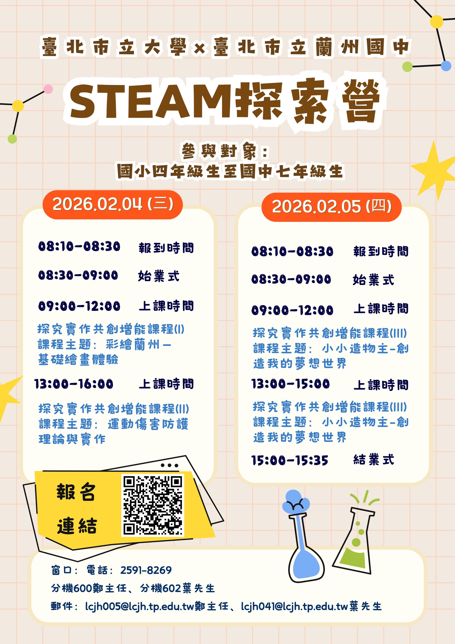 5、報名資格及名額:本市大同區、中山區國民小學五、 六年級學生、國中七年級學生,共計30人。