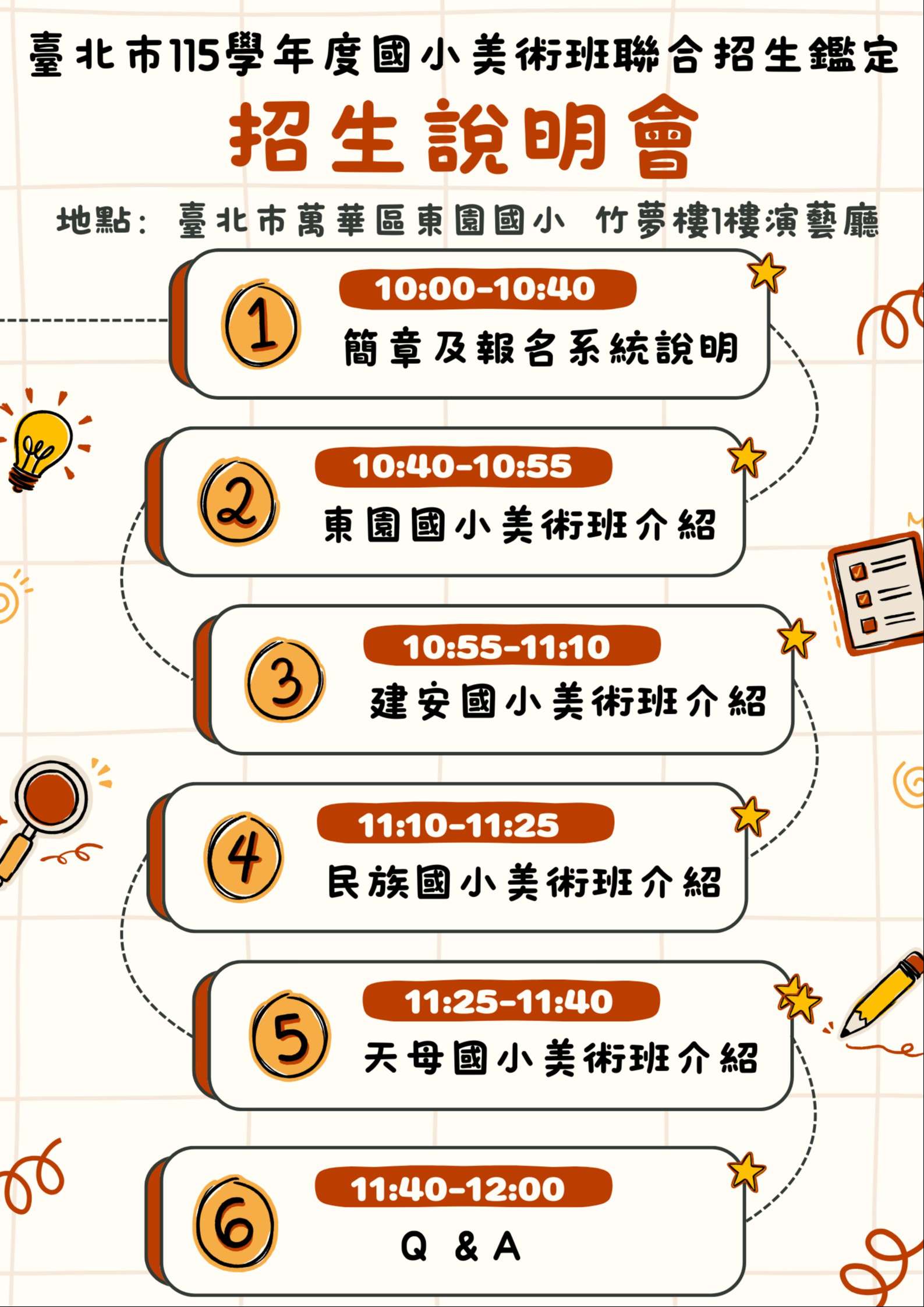 (三)活動內容:簡介本次國小藝術才能美術班招生鑑定考試期程及術科測驗相關內容,並說明各校美術班教學環境與學校特色。