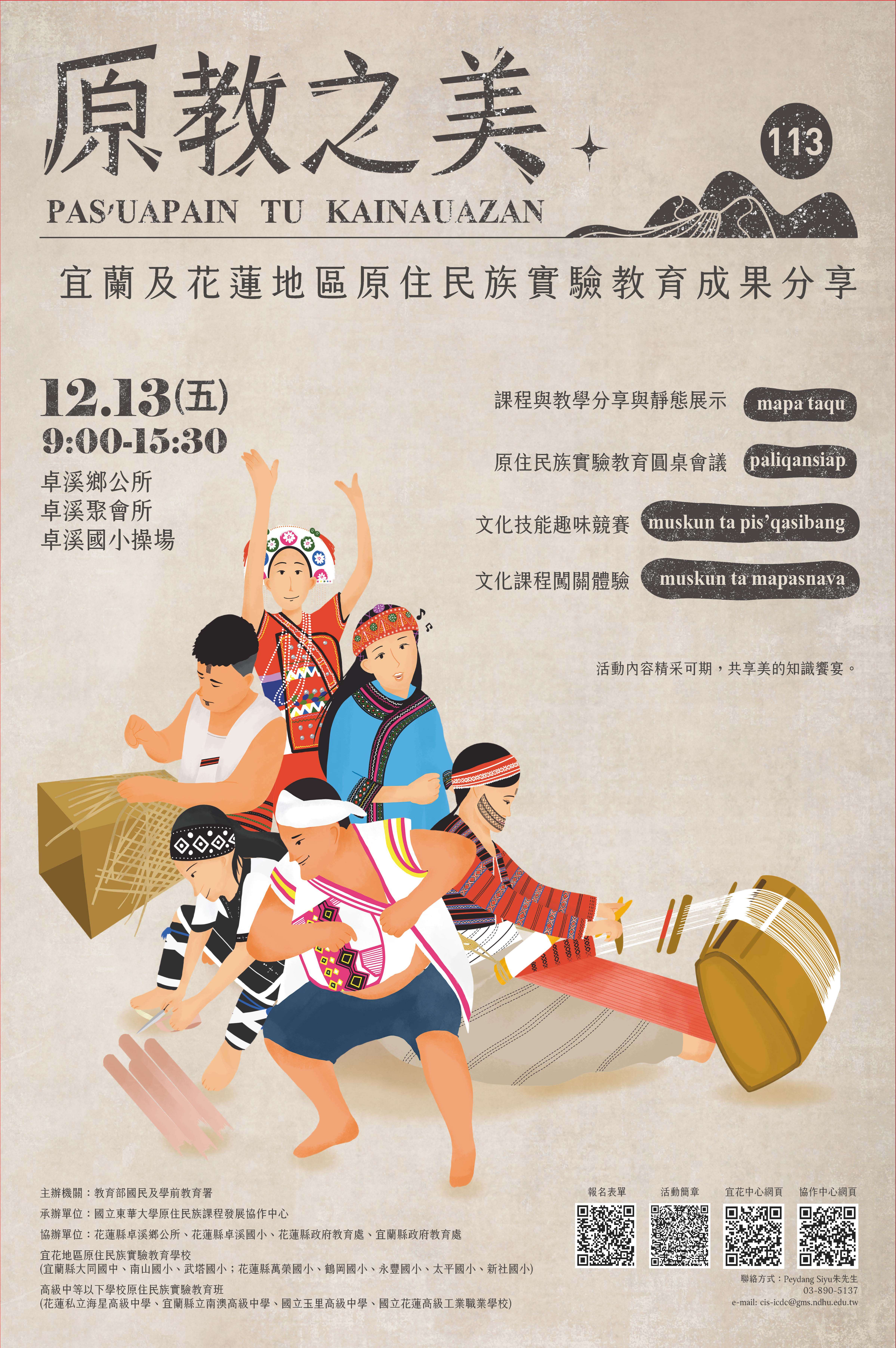 旨揭活動係由宜蘭及花蓮地區原住民族實驗學校進行課程、教學與學生學習成果分享,並透過文化課程體驗活動之方式,期能促進與會人員對於原住民族實驗教育有更為深入之理解,盼創造聚焦、交流及多元對話的機會,提供相互參照與學習的平台,此活動相關訊息如下: