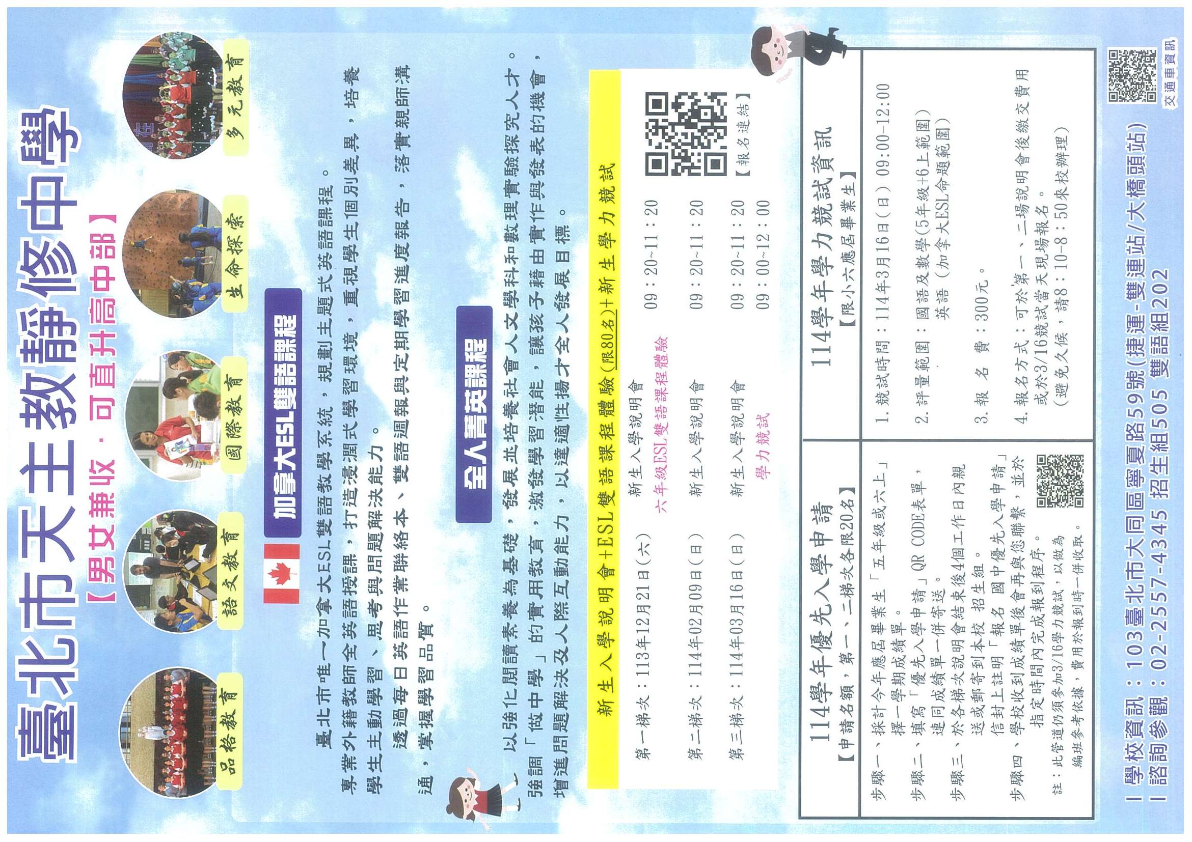 二、國中部招生說明會地點:臺北市大同區寧夏路72號。