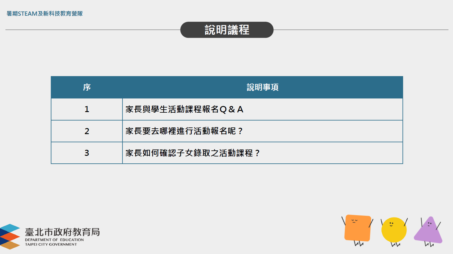 (一)招生對象:本局所屬公私立國民高級中學、國民中學及國民小學(含非學校型態實驗教育機構、國立學校)113學年度在學學生及其家長,各營隊年齡及名額限制詳見「計畫附件1課程表」。(二)報名方式: