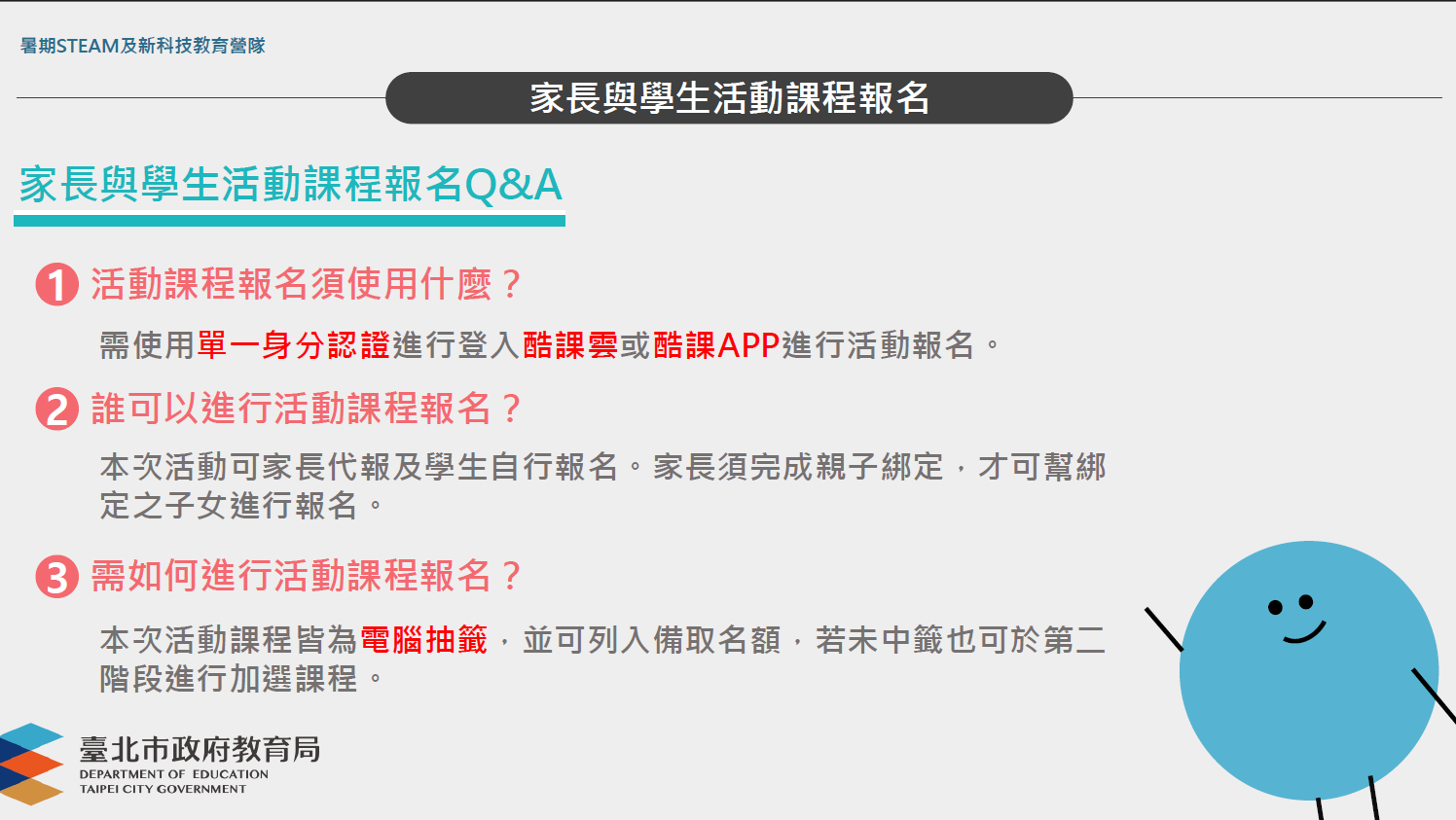1、本營隊活動一律採本市「酷課APP」或「酷課雲」(網 址:https://cooc.tp.edu.tw/)報名,並透過「酷課 APP」線上繳費(繳費方式可用信用卡、ATM及智慧支 付平臺方式)。2、活動可家長代報或學生自行報名(家長代報須完成親子綁定,才可幫綁定之子女進行報名),請學生預先備妥「單一身分驗證服務」(網址:https://ldap. tp.edu.tw)帳號以利報名。
