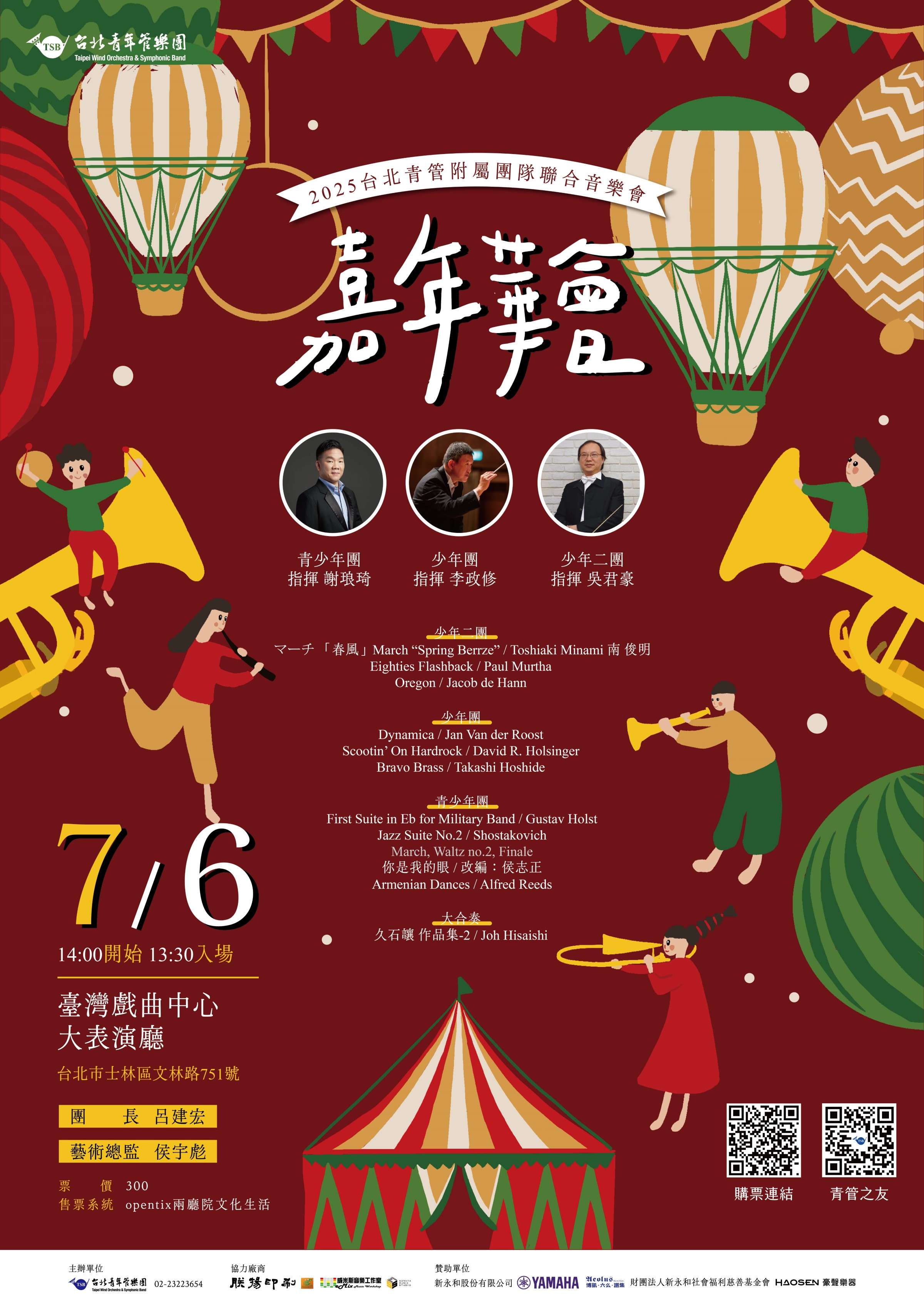 一、2025台北青管附屬團隊聯合音樂會《嘉年華會》,由謝琅 琦、李政修與吳君豪3位老師,指揮台北青管附屬團隊演 出,帶來一連串耳熟能詳的管樂經典曲目。